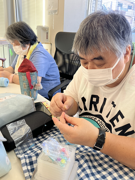 ビーズで作ったアクセサリーや、書画、編み物など、皆さん、得意な分野での作品作りが進んでいます。