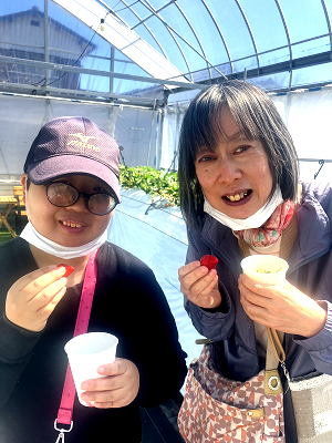 ⇩いちごは先の部分が甘いけん、ヘタの方から食べるんよ~、と教えてくれた利用者さん⇩