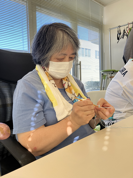 ビーズで作ったアクセサリーや、書画、編み物など、皆さん、得意な分野での作品作りが進んでいます。
